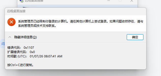 gpupdate /force刷新组策略,或者重新插拔一下网线触发验证。 - 错误代码 0x1107: 这个代码通常指代